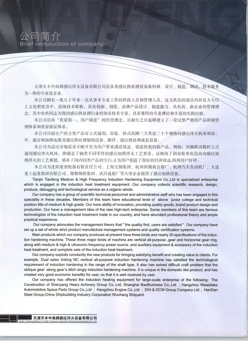 天津天豐中高頻感應(yīng)淬火設(shè)備有限公司擁有一批幾十年來一直從事本專業(yè)工作的科技人員和管理人員,這支隊伍的成員均具有大專以上文化程度及中、高級技術(shù)職稱,具有創(chuàng)新、創(chuàng)優(yōu)、品牌產(chǎn)品設(shè)計、制造能力、具有高、新企業(yè)的管理理念。其中有些同志為我國感應(yīng)熱處理行業(yè)的知名技術(shù)專家,具有雄厚的專業(yè)理論和豐富的實踐經(jīng)驗。本公司崇尚“質(zhì)量第一,用戶滿意”的經(jīng)營理念,自誕生之日起即建立了一套完整嚴(yán)密的產(chǎn)品研制管理體系和質(zhì)量保證體系。本公司目前生產(chǎn)的主要產(chǎn)品有立式通用,齒輪、臥式中頻齒圈三大類近二十個規(guī)格的感應(yīng)淬火機床和高、中、超音頻加熱電源及感應(yīng)熱處理輔助設(shè)備、附件、感應(yīng)熱處理成套設(shè)備。本公司為適應(yīng)市場需求不斷開發(fā)為用戶帶來滿意效益、創(chuàng)造價值的新產(chǎn)品,例如:雙軸聯(lián)動數(shù)控立式通用感應(yīng)淬火機床,即滿足了軸類不同零件的感應(yīng)加熱淬火工藝要求,還解決了斜齒輪單齒沿齒溝感應(yīng)加熱淬火的工藝難題,即填補了國內(nèi)同類產(chǎn)品的空白,又為用戶創(chuàng)造了很好的經(jīng)濟效益,得到用戶好評。本公司為沈陽重型機器有限責(zé)任公司提供的多功能雙軸數(shù)控淬火機床TF001型,能滿足工件Φ6500mm齒輪及軸類長度為2000mm范圍內(nèi)的大型零件的感應(yīng)淬火機床現(xiàn)已投入使用。為寶鋼集團提供的三臺感應(yīng)淬火機床,能滿足長度為4000mm直徑為Φ600mm,最大工件重量5T范圍內(nèi)的大型零件淬火機床已交付使用。杭州西湖離合器廠,需要一臺熱效率平合自動淬火機,生產(chǎn)節(jié)拍為4件/分,韓國有該設(shè)備但生產(chǎn)節(jié)拍只能滿足2件/分,通過我公司的努力,為西湖離合器廠順利完成了該項目,現(xiàn)已正式投產(chǎn),為用戶創(chuàng)造了很好的經(jīng)濟效益,并得到了用戶好評。