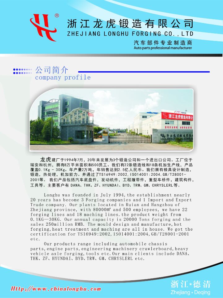 龍虎公司創(chuàng)立于1994年,其前身是瑞安龍虎鍛造廠,經過十余年的拼搏和奮斗,目前已擁有浙江龍虎鍛造公司、瑞安龍虎鍛造公司、瑞安龍虎電氣公司、德清進出口貿易公司等四個公司,成為我國制造業(yè)中專業(yè)從事汽車零件鍛造及機械加工的知名企業(yè)之一。公司總部坐落于風景秀美人杰地靈的莫干山畔,德清縣干山工業(yè)區(qū)55號,距杭州蕭山國際機場僅1小時車程,距上?;蛘邔幉ǜ蹆H2小時左右車程,左鄰寧杭高速鐵路德清站,地理位置優(yōu)越、物流交通便利。公司擁有一批高中級技術職稱為骨干的技術、管理人才和一支具有拼搏進取、團結、協(xié)作精神的優(yōu)秀員工隊伍,公司擁有專業(yè)鍛造生產線15條,年鍛造生產能力2萬噸,產品及模具設計均采用CAD/CAM技術,公司設有以機械加工中心及數控機床為主要設備的機械加工車間和以連續(xù)爐為主要設備的熱處理車間,以及專業(yè)的模具制造車間,公司擁有檢驗和實驗手段完善的質量檢測中心。公司專業(yè)生產汽車配件、工程機械、五金工具及建筑構件等四大類。各機型產品1000余種,主導產品有:12T-18T平臺車車輪軸頭、凸輪軸、制動器支架、凸輪軸支架、轉向節(jié)、半軸突緣、汽車懸掛、拉桿、發(fā)動機汽門搖臂、汽車門鉸鏈及錨件、吊環(huán)等。產品不僅銷往國內各知名主機企業(yè),在海外如德國、美國哥倫比亞、韓國、新加坡、泰國印度和臺灣等地也擁有廣泛的用戶。公司擁有完善、可靠的質量保障體系、和完備的用戶服務體系,并先后通過了ISO9002;QS9000;ISO/TS16949;ISO14000/18000等體系認證工作。公司全體員工牢固樹立了“用戶的需要就是我們的標準”的理念,愿以自己的優(yōu)良產品和優(yōu)質的工作為更加廣泛的用戶,提供竭誠周到的服務。