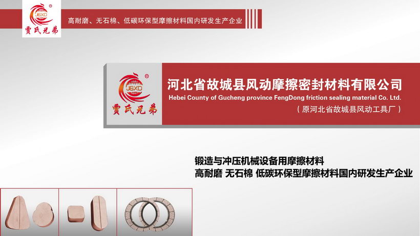 我公司始建于一九八四年,位于河北省東南部,南與山東北運河隔河相望,東與山東德州市接壤。廠址故城縣城北工業(yè)區(qū),緊靠邢德公路,占地面積3000余平方米,職工80余人,技術人員15人,固定資產(chǎn)180余萬元,專用設備10臺套。是專業(yè)生產(chǎn)鍛壓設備、沖壓設備摩擦塊、摩擦片的配套廠家。部分產(chǎn)品并出口國外,特別是高耐磨、低磨耗、無石棉、環(huán)保型摩擦塊受到國內外用戶的認可。