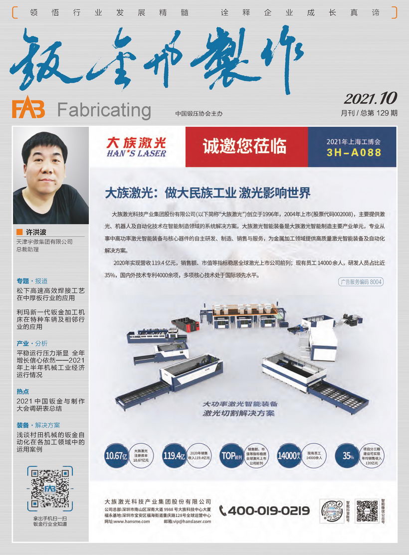 《鈑金與制作》雜志是中國鍛壓協(xié)會主辦的目前國內(nèi)惟一一本面向鈑金制作、管型線材加工行業(yè)的綜合性高端雜志。憑借中國鍛壓協(xié)會多年服務鈑金和管型線材行業(yè)的優(yōu)勢,努力搭建供應商與用戶企業(yè)間的信息平臺,做好政府、高校、科研院所及企業(yè)間溝通的橋梁。