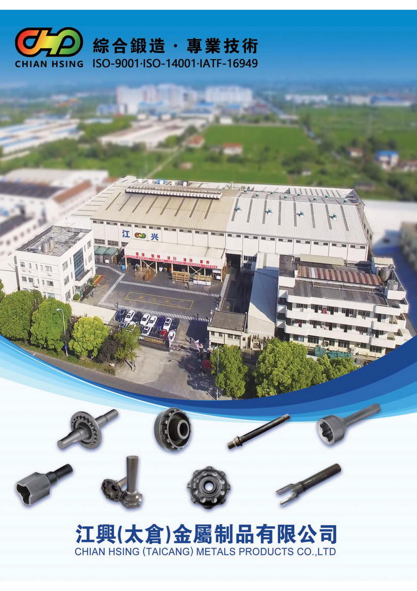 江興鍛壓工業(yè)股份有限公司自西元1971年創(chuàng)立以來,秉持著「顧客滿意、同仁樂意、經(jīng)營得意、永續(xù)經(jīng)營」之經(jīng)營理念,不斷開發(fā)綜合鍛造之技術(shù),使本公司所生產(chǎn)的鍛品更優(yōu)良、更精密、更能減少切削加工,使鍛品更臻于理想。于1997年在江蘇省太倉市設立江興(太倉)金屬制品有限公司,以及2012年設立江興(淮安)汽車部件有限公司,延續(xù)臺灣總部的經(jīng)營理念和專業(yè)技能,持續(xù)在國內(nèi)發(fā)展并精進冷溫熱綜合鍛造技術(shù)。