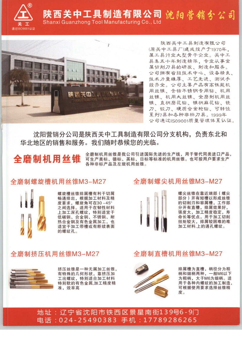 陜西關(guān)中工具制造有限公司(原關(guān)中工具廠)建成投產(chǎn)于1970年,屬工具行業(yè)大型骨干企業(yè)。關(guān)中工具集五十年制造精華,專業(yè)從事金屬切削刀具的研發(fā)、制造和服務。公司擁有省級技術(shù)中心、設(shè)備精良、技術(shù)力量雄厚、工藝先進、測試手段齊全。公司主要產(chǎn)品有高性能機用絲錐、含鈷不銹鋼專用鉆、機用絲錐、機用大絲錐、全磨制機用絲錐、直柄磨花鉆、錐柄麻花鉆、銑刀、鉸刀、硬質(zhì)合金槍鉆、可轉(zhuǎn)位系列7具和各種非標刀具。1999年公司通過IS09001質(zhì)量管理體系認證。