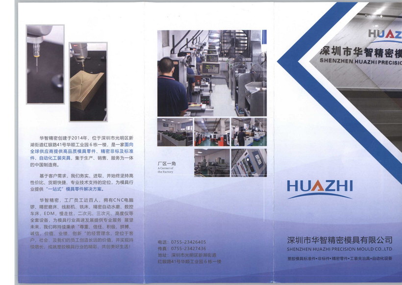 華智精密創(chuàng)建于2014年,位于深圳市光明區(qū)新湖街道紅銀路41號華順工業(yè)園6棟一樓,是一家面向全球供應(yīng)商提供高品質(zhì)模具零件、精密非標及標準件、自動化工裝夾具,集于生產(chǎn)、銷售、服務(wù)為一體的中國制造商?;诳蛻粜枨?,我們務(wù)實、進取、并始終堅持高性價比、貨期快捷、專業(yè)技術(shù)支持的定位,為模具行業(yè)提供“一站式”模具零件解決方案。華智精密,工廠員工近百人,擁有CNC電腦鑼、精密磨床、線割機、銑床、精密自動水磨、數(shù)控車床,EDM,慢走絲,二次元、三次元、高度儀等全套設(shè)備,為模具行業(yè)高速發(fā)展提供專業(yè)服務(wù) 展望未來,我們將持續(xù)秉承“尊重、信任、積極、拼搏、誠信,價值、業(yè)績、創(chuàng)新“的經(jīng)營理念,定位于客戶,社會,及我們的員工創(chuàng)造長遠的價值,并實現(xiàn)持續(xù)增長,成就塑膠模具行業(yè)的精彩,共創(chuàng)美好生活!