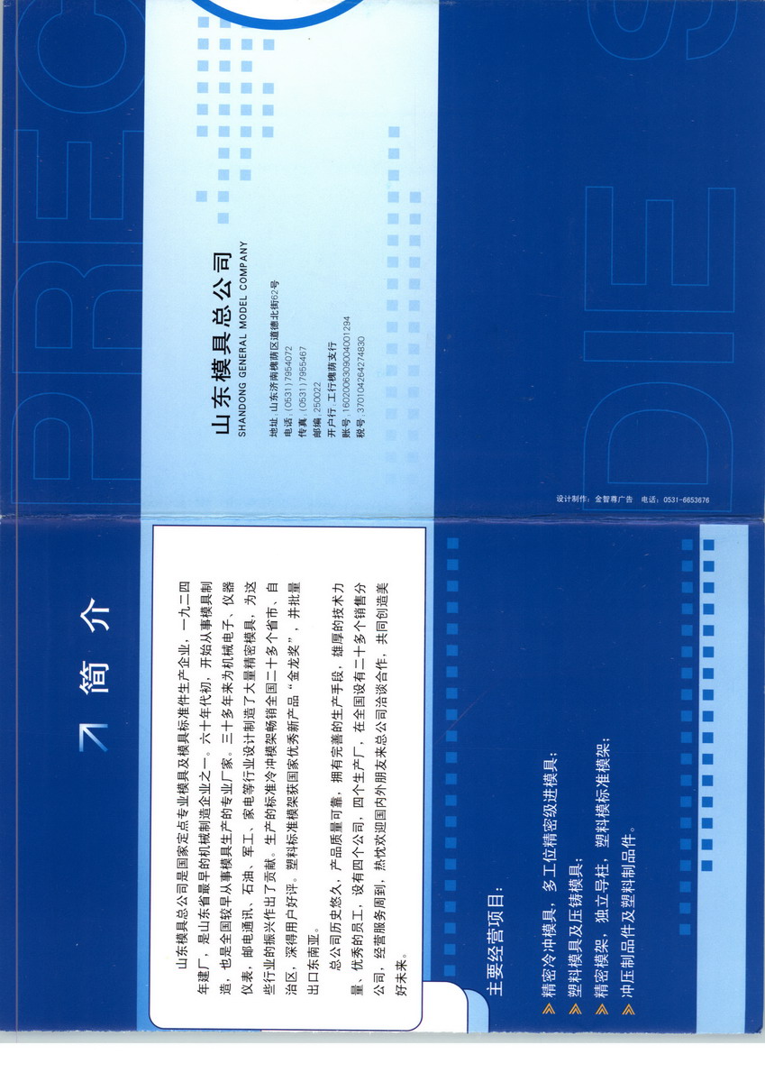 山東模具總公司主要經(jīng)營(yíng):冷沖模架模具注塑模架等產(chǎn)品。公司尊崇“踏實(shí)、拼搏、責(zé)任”的企業(yè)精神,并以誠(chéng)信、共贏、開創(chuàng)經(jīng)營(yíng)理念,創(chuàng)造良好的企業(yè)環(huán)境,以全新的管理模式,完善的技術(shù),周到的服務(wù),卓越的品質(zhì)為生存根本,我們始終堅(jiān)持用戶至上 用心服務(wù)于客戶,堅(jiān)持用自己的服務(wù)去打動(dòng)客戶。