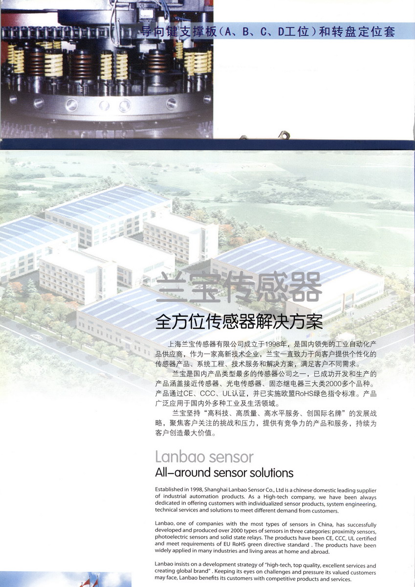 蘭寶傳感科技股份有限公司主要業(yè)務(wù)為工業(yè)測(cè)控傳感器的研發(fā)、生產(chǎn)、銷售及應(yīng)用,為客戶提供標(biāo)準(zhǔn)化和定制化的工業(yè)測(cè)控傳感器及工業(yè)測(cè)控傳感系統(tǒng)。產(chǎn)品系列已通過(guò)CCC認(rèn)證、CE認(rèn)證、UL認(rèn)證和ISO9001:2008質(zhì)量管理體系認(rèn)證,并已實(shí)施歐盟RoHS環(huán)保指令,主要包括電感式傳感器、光電式傳感器、電容式傳感器和陶瓷厚膜壓力傳感器等三十多個(gè)系列、3000余種規(guī)格型號(hào)。各項(xiàng)產(chǎn)品技術(shù)性能居行業(yè)領(lǐng)先地位,其中多個(gè)系列產(chǎn)品達(dá)到國(guó)際先進(jìn)水平。蘭寶依托自身技術(shù)優(yōu)勢(shì)為客戶定制符合需求的工業(yè)測(cè)控傳感系統(tǒng)。
