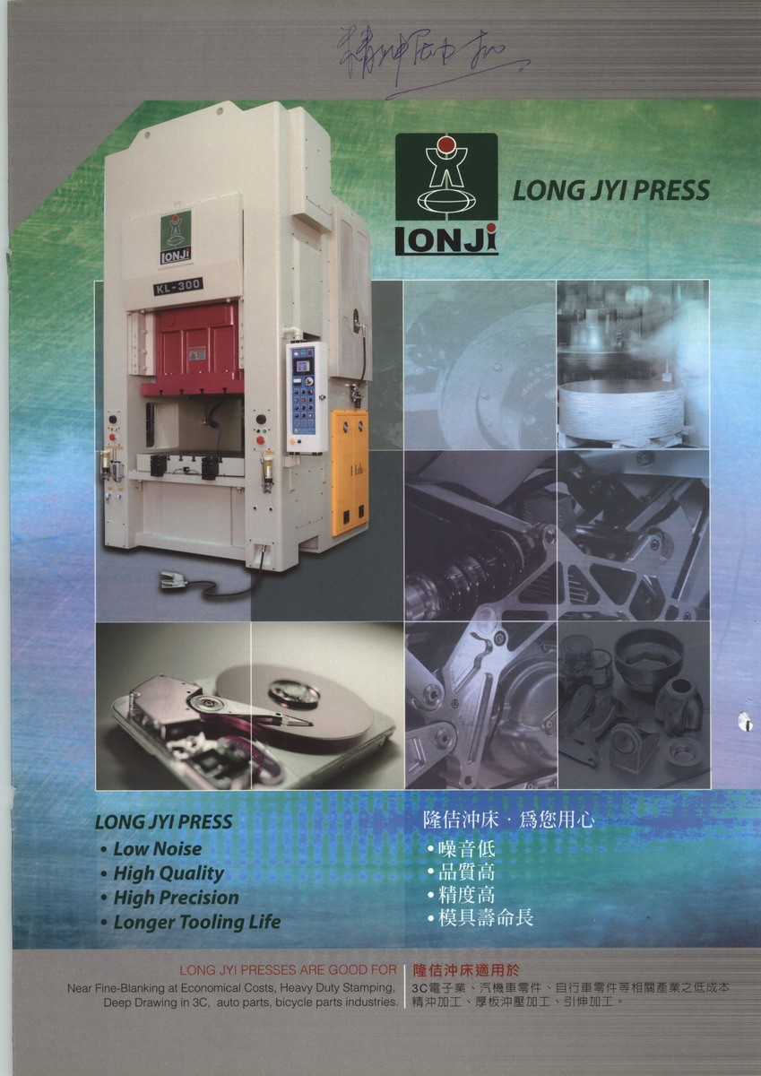 隆佶公司創(chuàng)立于1983年,生產(chǎn)專業(yè)之機(jī)械式?jīng)_床。多年來(lái)不斷以 二D 一A的理念來(lái)創(chuàng)新研發(fā)精良的產(chǎn)品,產(chǎn)品差異化(Differentiation)、精良的成本(Down cost),并站在客戶的角度預(yù)先研發(fā)(Advance research),讓產(chǎn)品更精進(jìn),并在沖床結(jié)構(gòu)及發(fā)明上獲得多項(xiàng)專利,使得沖床品質(zhì)精良,并具有優(yōu)越性能及多項(xiàng)優(yōu)點(diǎn),在業(yè)界已建立良好的口碑與專業(yè)形象。
