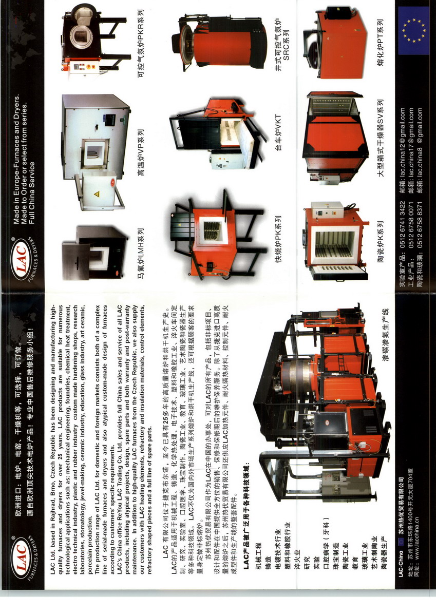 LACLtd.basedinRajhrad,Brno,CzechRepublichas,beendesigningandmanufacturinghighqualityfurnacesanddryersforover25years.LACproductsaresuitablefornumeroustechnologicalapplicationssuchas:mechanicalengineering,foundries,chemicalheattreatment,electrotechnical,plasticandrubber,custommade,hardeningshops,research,laboratories,stomatology,jewelmaking,ceramics,education,glassindustry,artceramicsandporcelainproduction.TheproductionrangeofLACfordomesticandforeignmarketsconsistsbothofacomplexlineofserial-made,furnacesanddryersandalsoatypicalcustom-madedesignoffurnacesaccordingtothecustomer'sspecificrequirements.LAC'sChinaofficeReYouLACTradingCo.Ltd.providesfullChinasalesandserviceofallLACproducts,includingatypicalprojects,design,sparepartsandbothwarrantyandpost-warrantymaintenance. InadditiontohighqualityLACfurnacesfromtheCzechRepublic,wealsosupplyourcustomerswithLACheatingelements,refractoryandinsulationmaterials,controlelements,refractoryshapedpiecesandafulllineofspareparts.