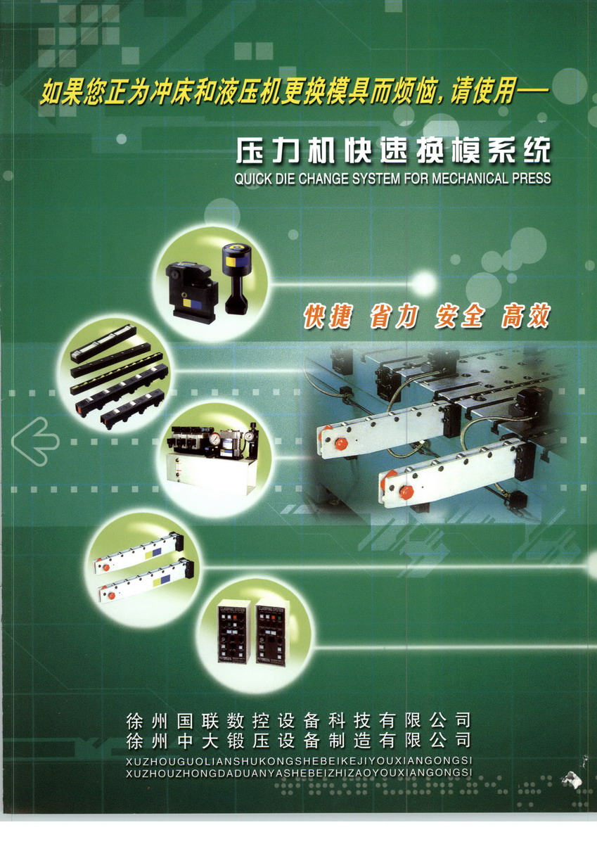 徐州國聯(lián)數(shù)控設(shè)備科技有限公司是一家集機電產(chǎn)品研發(fā)、生產(chǎn)、銷售與一體的高新科技企業(yè),擁有機械、液壓、電器行業(yè)工程師多名,有較強的自主設(shè)計能力,為“徐州中大鍛壓”提供強有力的技術(shù)保證。由“國聯(lián)數(shù)控”研發(fā)、“中大鍛壓”生產(chǎn)的快速換模系統(tǒng),是采用國外先進技術(shù)開發(fā)生產(chǎn)的自動化程度高、省力、快速的換模系統(tǒng)。廣泛應(yīng)用于沖床、油壓機、壓鑄機、注塑機和汽車制造等行業(yè),它可以使您在幾分鐘之內(nèi)完成模具的更換和加緊工作,對降低成本、減輕勞動強度、提高生產(chǎn)效率提供了安全、快捷的保證。特別適用于產(chǎn)品的小批量、多樣化生產(chǎn)。我們以“誠信”為企業(yè)發(fā)展之本,以“永遠讓顧客滿意”為宗旨,竭誠為您提供優(yōu)質(zhì)的產(chǎn)品和良好的服務(wù)。我們充分認識到,企業(yè)做大做強、可持續(xù)發(fā)展“任重而道遠”,與國外先進企業(yè)相比,還需要加倍努力。我們將把過去成功的業(yè)績當(dāng)成“持續(xù)發(fā)展的資本和基石”,為民族工業(yè)的發(fā)展作出應(yīng)有的貢獻。