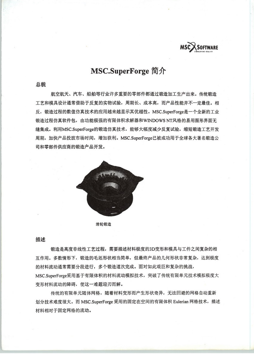 MSC軟件是世界十大原創(chuàng)軟件公司之一,是全球多學(xué)科仿真模擬領(lǐng)域的領(lǐng)導(dǎo)者。作為一家可被信任的企業(yè),MSC軟件公司能夠協(xié)助其合作公司在設(shè)計與測試其制造的產(chǎn)品方面提高質(zhì)量、節(jié)約時間并降低成本。各類院校、研究人員和學(xué)者利用MSC的先進(jìn)技術(shù),在拓展其獨(dú)有相關(guān)知識的同時,延伸了其仿真模擬的應(yīng)用范圍。位居世界前列的各大生產(chǎn)廠商使用MSC軟件公司的工程仿真技術(shù),進(jìn)行線性和非線性的有限元分析(FEA)、聲學(xué)、流固耦合、多物理場、優(yōu)化、耐久性、多體動力學(xué)以及控制系統(tǒng)的仿真模擬。這些工具能夠真實(shí)準(zhǔn)確地預(yù)測工業(yè)產(chǎn)品在真實(shí)世界中的性能表現(xiàn),從而協(xié)助工程師設(shè)計出更富有創(chuàng)新力的產(chǎn)品——并且更加快速、成本利用更加有效。