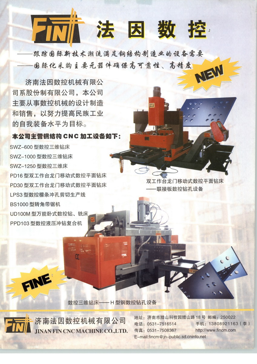 公司的主業(yè)突出、產(chǎn)品集中,其主營(yíng)產(chǎn)品為鋼結(jié)構(gòu)系列數(shù)控成套加工設(shè)備,主要用于型鋼、板材、線材的數(shù)控加工,有效替代了同類產(chǎn)品的進(jìn)口?,F(xiàn)有主導(dǎo)產(chǎn)品具體分為五大類,高檔落地鏜銑加工中心、鐵塔數(shù)控加工設(shè)備、建筑鋼結(jié)構(gòu)數(shù)控加工設(shè)備、大型板材數(shù)控加工設(shè)備及汽車數(shù)控加工設(shè)備。公司產(chǎn)品通過(guò)數(shù)字化的操作程序,對(duì)型鋼和板材進(jìn)行鉆孔、沖孔、銑削、切割、鋸斷、打標(biāo)記等系列加工,并能實(shí)現(xiàn)多功能、多工序的自動(dòng)連續(xù)生產(chǎn),充分體現(xiàn)了成套化、復(fù)合化、高效化、大型化、柔性化數(shù)控機(jī)床的特點(diǎn),這也是國(guó)際數(shù)控裝備行業(yè)發(fā)展的主流趨勢(shì)。十年的孜孜以求,法因數(shù)控的多項(xiàng)產(chǎn)品列為國(guó)家級(jí)重點(diǎn)國(guó)際科技合作項(xiàng)目、科技攻關(guān)項(xiàng)目、火炬計(jì)劃項(xiàng)目和國(guó)家重點(diǎn)新產(chǎn)品計(jì)劃項(xiàng)目,并多次榮獲科技進(jìn)步獎(jiǎng)、省市先進(jìn)企業(yè)和誠(chéng)信守法企業(yè)稱號(hào)。