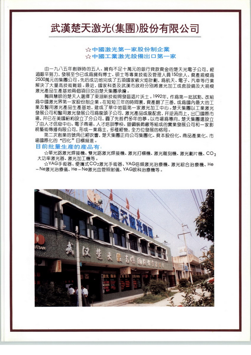 楚天激光1985年成立于武漢,是武漢· 中國光谷的核心企業(yè),員工1000多人。成立近30年來,楚天激光的發(fā)展得到了國內(nèi)外領導人的關心,22位黨和國家領導人,5位外國領導人蒞臨楚天激光。公司是“神六航天工程立功單位”,也為“神七”、“神八”飛船配套。從神舟一號到神舟八號,楚天激光都是指定的激光應用服務商。400多項國家專利,是中國激光行業(yè)中最多的。行業(yè)領域涉及:航天、航空、電子、醫(yī)療、衛(wèi)生、冶金、文化等。