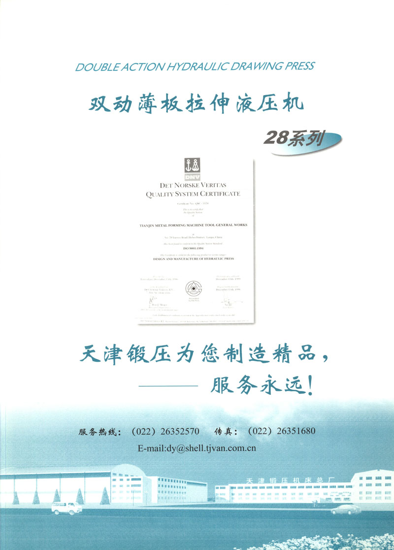 天津市鍛壓機(jī)床總廠是我國起步最早的企業(yè),現(xiàn)有固定資產(chǎn)2.4億元各類專業(yè)技術(shù)人員480人,是機(jī)械部大型骨干企業(yè)。自我廠自行設(shè)計(jì)國內(nèi)第一臺(tái)液壓機(jī),開創(chuàng)了我國中小型液壓機(jī)生產(chǎn)歷史以來,目前擁有26個(gè)系列,300余品種,產(chǎn)品從80KN至5000KN,以形成年產(chǎn)1200臺(tái)各類液壓機(jī)的生產(chǎn)能力,居國內(nèi)同行業(yè)之首。1983年YT32-315四柱液壓機(jī)獲國家銀牌,1990年YT32-630/1030雙動(dòng)力拉伸液壓機(jī)一舉榮獲同行業(yè)唯一的國家金獎(jiǎng)另有部優(yōu)產(chǎn)品3項(xiàng),市優(yōu)產(chǎn)品5項(xiàng)。產(chǎn)品廣泛適用于汽車制造、粉末冶金、金屬冷擠、輕工家電、化工機(jī)戒、航空航天、模具磨料、機(jī)戒制造等行業(yè),被國家指定為替代進(jìn)口產(chǎn)品,行銷全國,產(chǎn)品出口到日本、荷蘭、東南亞等20多個(gè)地區(qū)和國家、市場占有率居全國同行業(yè)第一。