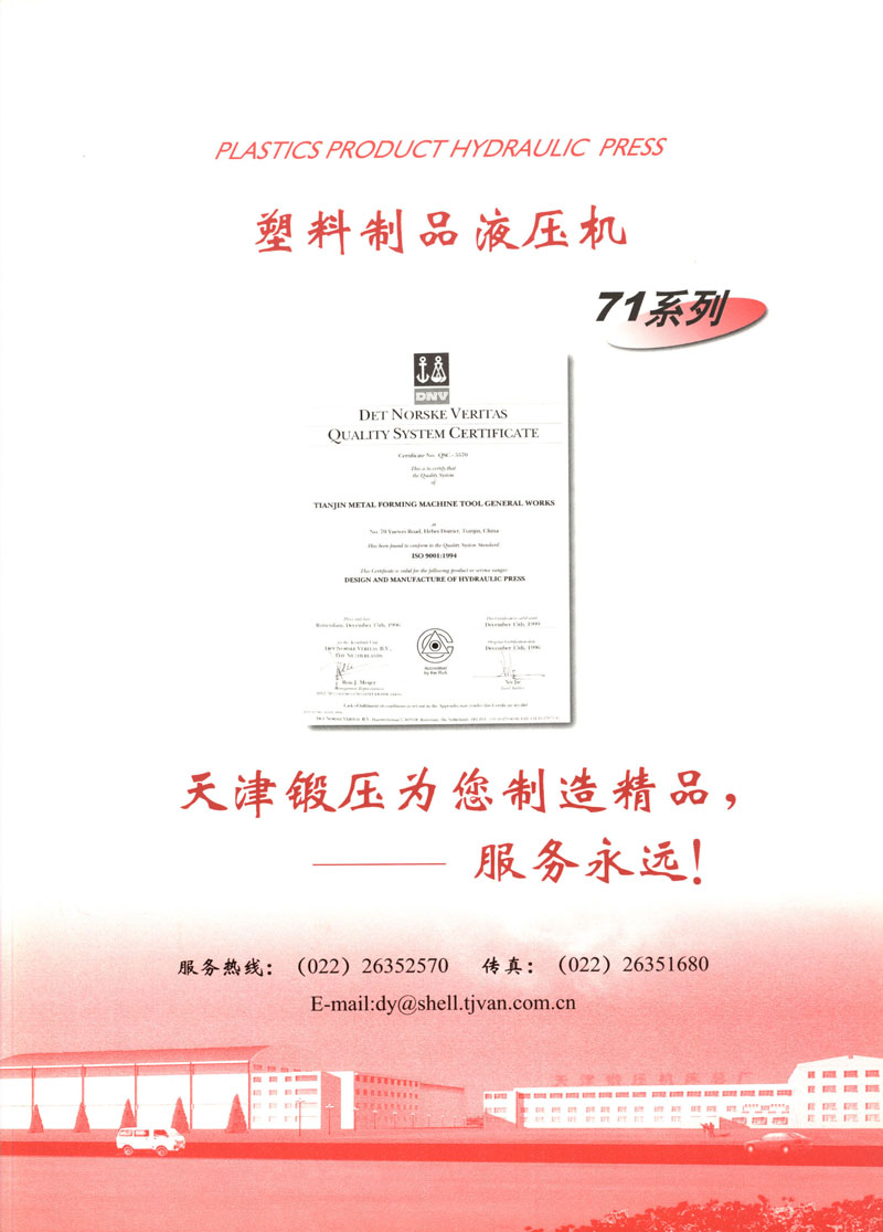 天津市鍛壓機(jī)床總廠是我國起步最早的企業(yè),現(xiàn)有固定資產(chǎn)2.4億元各類專業(yè)技術(shù)人員480人,是機(jī)械部大型骨干企業(yè)。自我廠自行設(shè)計國內(nèi)第一臺液壓機(jī),開創(chuàng)了我國中小型液壓機(jī)生產(chǎn)歷史以來,目前擁有26個系列,300余品種,產(chǎn)品從80KN至5000KN,以形成年產(chǎn)1200臺各類液壓機(jī)的生產(chǎn)能力,居國內(nèi)同行業(yè)之首。1983年YT32-315四柱液壓機(jī)獲國家銀牌,1990年YT32-630/1030雙動力拉伸液壓機(jī)一舉榮獲同行業(yè)唯一的國家金獎另有部優(yōu)產(chǎn)品3項,市優(yōu)產(chǎn)品5項。產(chǎn)品廣泛適用于汽車制造、粉末冶金、金屬冷擠、輕工家電、化工機(jī)戒、航空航天、模具磨料、機(jī)戒制造等行業(yè),被國家指定為替代進(jìn)口產(chǎn)品,行銷全國,產(chǎn)品出口到日本、荷蘭、東南亞等20多個地區(qū)和國家、市場占有率居全國同行業(yè)第一。