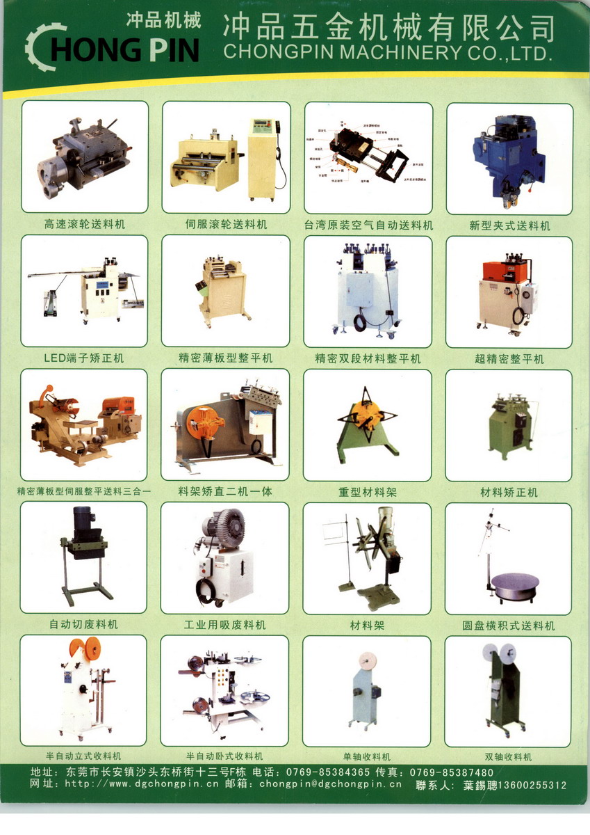 東莞市沖品五金機械有限公司創(chuàng)立于2004年1月,公司負責人經過多年對沖壓周邊設備的摸索各學習,專業(yè)成立了沖品機械有限公司。本公司專業(yè)從事五金沖壓周邊設備,整廠規(guī)劃制造銷售與維修。 代理“日本兄弟BROTHER”精密攻牙機、精密自動空壓鉚釘機;臺灣金上源油壓高速沖床及專用機;臺灣彰年發(fā)空、油壓鉚釘機。 專業(yè)制造:沖床隔音箱、端子收料機、圓盤送料機、吸廢料機、材料架、整平機、油壓機等相關產品。 我們將一如繼往,秉持品質、合作、服務之原則為您提供產品質量全方位服務,堅持價格合理以質取勝之原則期盼與您合作,也期待您的支持與惠顧。