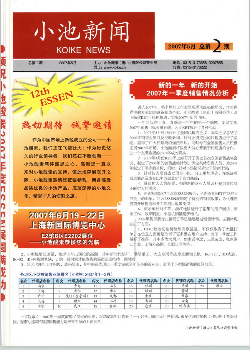小池酸素系列產(chǎn)品自上世紀(jì)六十年代進(jìn)入中國(guó),經(jīng)過(guò)多年不懈努力,小池酸素切割設(shè)備已經(jīng)廣泛應(yīng)用干中國(guó)的造船業(yè)、橋梁、工程機(jī)械、金屬加工業(yè)等許多相關(guān)行業(yè),尤其在造船行業(yè),小池酸素切割機(jī)是大部分船廠(chǎng)下料的主力軍。小池酸素在中國(guó)有近30家代理機(jī)構(gòu),除唐山本部外,在上海、北京、廣州等地均設(shè)有技術(shù)服務(wù)中心,為廣大用戶(hù)提供及時(shí)周到的售前、售中和售后服務(wù)。小池酸素系