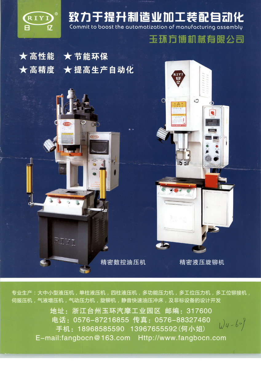 浙江玉環(huán)方博機(jī)械有限公司是一家專業(yè)致力于高速單柱液壓機(jī)、數(shù)控單柱液壓機(jī)、數(shù)控單臂液壓機(jī)、數(shù)控小型壓力機(jī)、中小型液壓機(jī)、單柱液壓機(jī)、單臂液壓機(jī)、四柱液壓機(jī)、數(shù)控液壓機(jī)、精密液壓機(jī)、全自動(dòng)液壓機(jī)、旋鉚機(jī),鉚接機(jī)、鉚釘機(jī)、小型壓力機(jī)、四柱油壓機(jī)、全自動(dòng)油壓機(jī)、弓形油壓機(jī)、多功能液壓機(jī)、通用液壓機(jī)、多工位壓力機(jī)、轉(zhuǎn)盤式壓力機(jī)、伺服壓力機(jī)、伺服壓裝機(jī)、伺服沖床,電子壓裝機(jī)、伺服液壓機(jī)、伺服油壓機(jī)、電液伺服壓力機(jī)、氣液增壓機(jī)、氣動(dòng)壓力機(jī)、氣動(dòng)沖床、全自動(dòng)旋鉚機(jī)、油壓沖床、數(shù)控油壓機(jī)、油壓拉伸機(jī)、及各種非標(biāo)壓力機(jī)的設(shè)計(jì)開發(fā)、制造與技術(shù)服務(wù)的高新技術(shù)企業(yè)。產(chǎn)品廣泛使用于汽車零部件,家電,五金,橡膠,粉末治金等行業(yè)的裝配-滾壓-拉伸成形-彎曲-鉚壓-熱壓-壓印等加工。本公司在引進(jìn)德國、日本等國家先進(jìn)的控制技術(shù)及機(jī)床設(shè)計(jì)理念的基礎(chǔ)上,結(jié)合國內(nèi)相關(guān)行業(yè)的實(shí)際需要,開發(fā)出各種臺式、落地式全系列機(jī)床。液壓密封件、氣動(dòng)密封件、電磁閥、液壓缸等都選用國外知名企業(yè)品牌產(chǎn)品、部分選用國內(nèi)品牌??刂葡到y(tǒng)選用德國西門子PLC、日本歐姆龍、法國斯耐德等知名品牌的電器元件,使設(shè)備性能更加穩(wěn)定,操作方便。本公司機(jī)身等鑄件采用精密鑄造,高溫處理、去應(yīng)力退火、正火、自然時(shí)效處理等消除內(nèi)應(yīng)力,保證鑄件性能,防止鑄件變形和破壞,氣動(dòng)床身采用QT450球墨鑄鐵并經(jīng)過各種必要的熱處理保證鑄件性能。本公司擁有一支專業(yè)從事專業(yè)機(jī)床設(shè)計(jì)、加工與維修服務(wù)的技術(shù)隊(duì)伍,能夠獨(dú)立完成機(jī)械結(jié)構(gòu)、電器與壓力控制系統(tǒng)的設(shè)計(jì);并應(yīng)用現(xiàn)代優(yōu)化設(shè)計(jì)理念與分析軟件,進(jìn)行受力分析和優(yōu)化設(shè)計(jì);能夠自主完成產(chǎn)品的全部機(jī)械加工與組裝調(diào)試,可以根據(jù)客戶需要進(jìn)行各種特殊的非標(biāo)準(zhǔn)機(jī)器與模具的設(shè)計(jì)和制作,產(chǎn)品生產(chǎn)周期短,并且提供運(yùn)輸、安裝、調(diào)試等一條龍服務(wù)。本公司的產(chǎn)品曾出口美國,英國,法國,墨西哥,意大利,土耳其,日本,韓國,西班牙,德國,意大利,智利,埃及,泰國等等。玉環(huán)方博機(jī)械有限公司是壓力機(jī)、中小型液壓機(jī)、四柱液壓機(jī)、油壓機(jī)、氣壓機(jī)、增壓機(jī)、旋鉚機(jī)、多工位壓力機(jī)、全自動(dòng)壓鉚機(jī)等產(chǎn)品專業(yè)生產(chǎn)加工的有限責(zé)任公司(自然人投資或控股),公司總部設(shè)在浙江玉環(huán)汽摩配工業(yè)園,玉環(huán)方博機(jī)械有限公司擁有完整、科學(xué)的質(zhì)量管理體系。玉環(huán)方博機(jī)械有限公司的誠信、實(shí)力和產(chǎn)品質(zhì)量獲得業(yè)界的認(rèn)可。歡迎各界朋友蒞臨玉環(huán)方博機(jī)械有限公司參觀、指導(dǎo)和業(yè)務(wù)洽談。