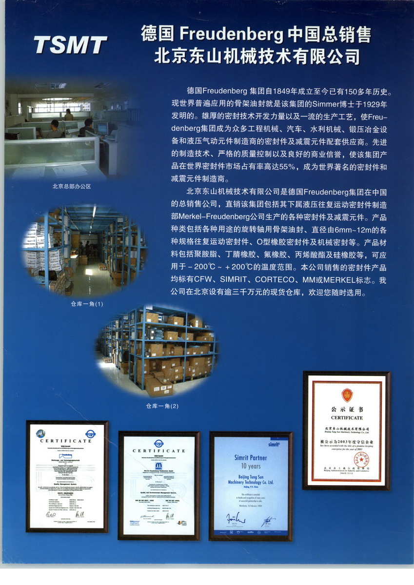 北京東山機(jī)械技術(shù)有限公司(TSMT)成立于1994年,是香港東山工程有限公司(TSE)董事長在1992年成功將世界最大的密封件與減震元件制造商德國FREUDENBERG密封與減震技術(shù)集團(tuán)公司(FDS)產(chǎn)品引進(jìn)中國后,專門在北京注冊成立的一家香港獨(dú)資企業(yè),全面負(fù)責(zé)德國FDS集團(tuán)產(chǎn)品在中國市場的銷售和推廣。