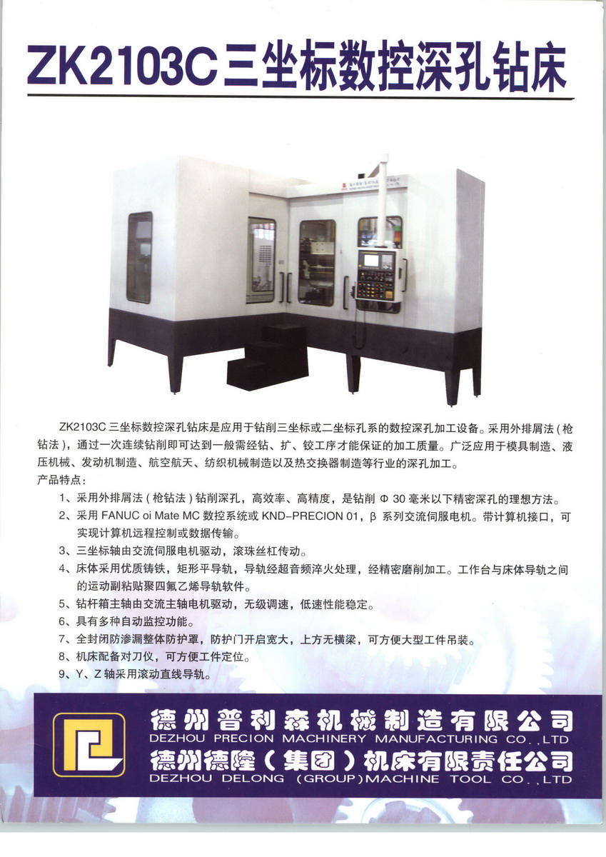 德州德?。瘓F(tuán))機(jī)床有限責(zé)任公司,2001年在德州機(jī)床廠(chǎng)改制基礎(chǔ)上投資組建。2002年德州機(jī)床廠(chǎng)進(jìn)一步改制為德州普利森機(jī)械制造有限公司,實(shí)現(xiàn)了國(guó)有資產(chǎn)退出,德州德?。瘓F(tuán))機(jī)床有限責(zé)任公司相應(yīng)成為德州普利森機(jī)械制造有限公司的子公司。始建于1945年,中國(guó)機(jī)械工業(yè)企業(yè)500強(qiáng)之一,國(guó)家機(jī)床行業(yè)重點(diǎn)企業(yè),山東省環(huán)保產(chǎn)業(yè)重點(diǎn)企業(yè)。公司占地總面積46萬(wàn)平方米,總資產(chǎn)3.2億元,各類(lèi)主要生產(chǎn)設(shè)備800余臺(tái),工藝裝備居全國(guó)同行業(yè)先進(jìn)水平。下設(shè)機(jī)床、鑄造、環(huán)保設(shè)備、特型油缸、印刷機(jī)械等6個(gè)子公司和10個(gè)分廠(chǎng)車(chē)間,現(xiàn)有員工1700人,其中高、中級(jí)專(zhuān)業(yè)技術(shù)人員360人。公司擁有自主進(jìn)出口經(jīng)營(yíng)權(quán),通過(guò)了ISO9001:2000版國(guó)際質(zhì)量管理體系認(rèn)證,設(shè)有省級(jí)企業(yè)技術(shù)開(kāi)發(fā)中心和山東省深孔加工工程技術(shù)研究中心,建有4800平方米的恒溫凈化試驗(yàn)車(chē)間,產(chǎn)品開(kāi)發(fā)全部采用CAD和CAPP等現(xiàn)代化手段。