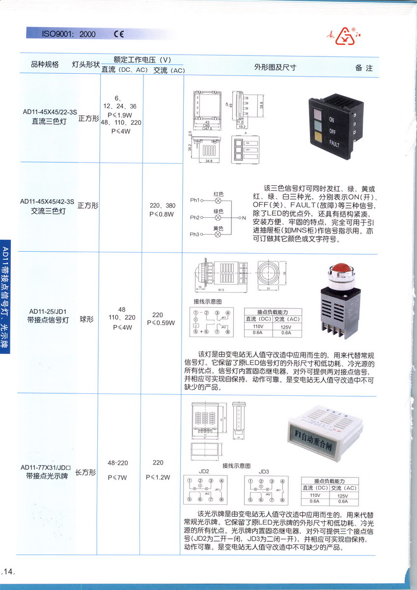 公司已通過ISO9001:2000質(zhì)量管理體系認證。AD11系列信號燈、LA38系列按鈕、CJK22系列信號燈及按鈕均已通過CE認證。CJK22系列產(chǎn)品通過了船用產(chǎn)品型式試驗。