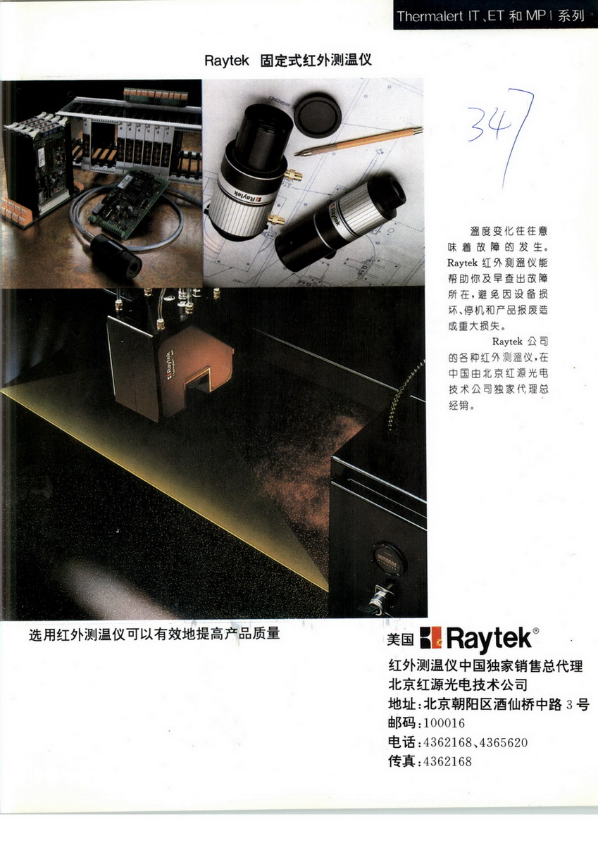 北京紅源光電技術(shù)公司成立于1988年,是北京市的高新技術(shù)公司。經(jīng)過二十年的不懈努力,公司在產(chǎn)品質(zhì)量,生產(chǎn)能力,新品研發(fā)以及基礎(chǔ)建設(shè)等方面都得到了新的提高和發(fā)展,至今已成為集紅外光學(xué)鏡頭、紅外熱像儀設(shè)計(jì)生產(chǎn)以及銷售紅外產(chǎn)品為一體的專業(yè)公司,其產(chǎn)品已經(jīng)被國內(nèi)外的許多單位所采用。2010年1月通過ISO9001質(zhì)量管理體系認(rèn)證。公司自成立之日起,便利用自己的專業(yè)優(yōu)勢從事高科技產(chǎn)品的研制、生產(chǎn)和銷售業(yè)務(wù)。1989至1994年作為美國Raytek公司紅外輻射測溫儀在中國的銷售總代理,1995年與該公司共同投資成立了中美合資北京雷泰光電技術(shù)有限公司,為紅外測溫儀在中國廣泛應(yīng)用打開了道路。近年來,公司的業(yè)務(wù)有了較大的發(fā)展,在已經(jīng)能大批量生產(chǎn)各種固定式紅外鏡頭的基礎(chǔ)上,又先后研制出了用于改變熱像儀視場的變倍鏡頭、雙視場變換鏡頭、連續(xù)變焦鏡頭、近焦鏡頭等。目前公司已有能力為用戶設(shè)計(jì)、制作各種特殊用途和規(guī)格的紅外鏡頭。并利用公司在紅外鏡頭方面的實(shí)力,陸續(xù)推出了采用美、英、法等國生產(chǎn)的非制冷焦平面組件、配以不同的紅外鏡頭,組成了能用于安全監(jiān)控、夜間觀察等用途的手持式或固定式熱像儀。公司還代理銷售美國FLUKE公司和FLIR公司的測溫儀和熱像儀等產(chǎn)品,在國內(nèi)獲得大量用戶的好評(píng)。為了保證產(chǎn)品的質(zhì)量,公司建立了質(zhì)量保證體系,成立了質(zhì)保部門。購置了環(huán)境試驗(yàn)設(shè)備、紅外鏡頭和熱像儀的監(jiān)測裝置等。