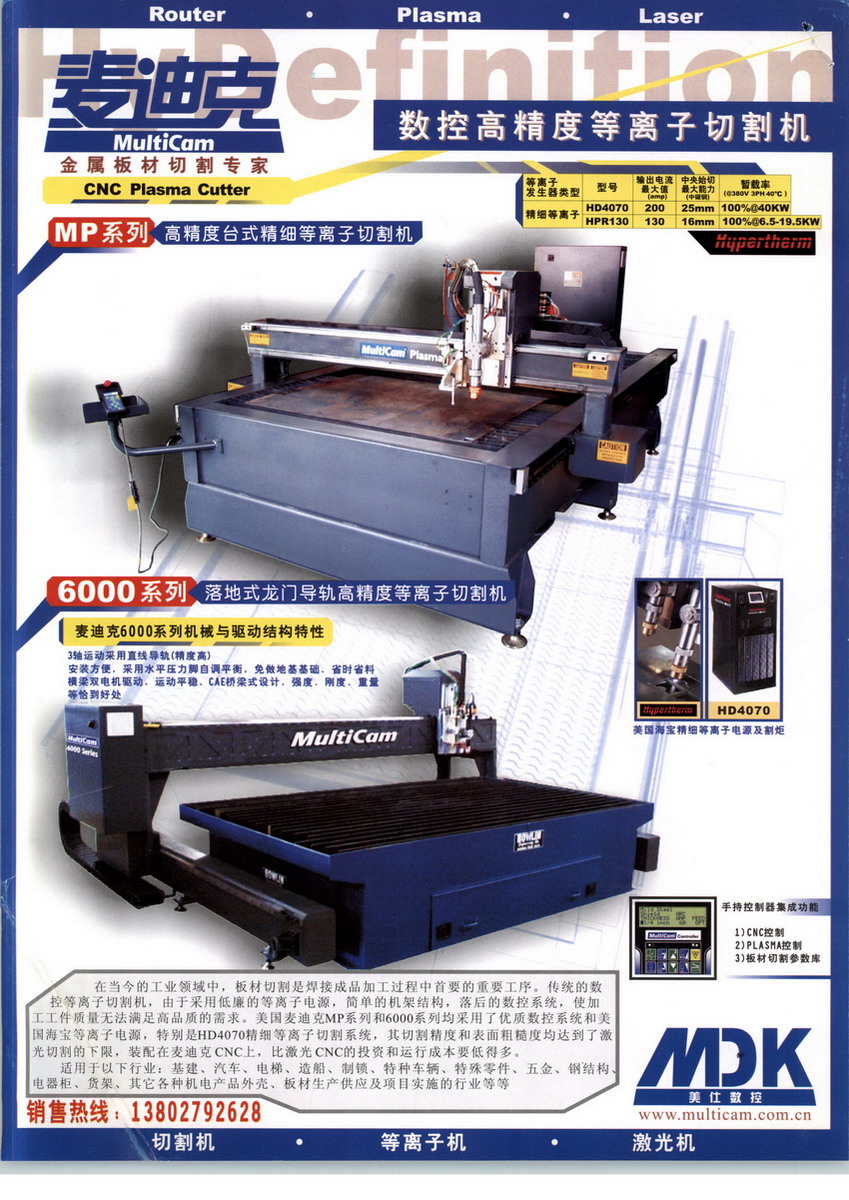 美國麥迪克致力于生產效率高、易于維護、經(jīng)久耐用的數(shù)控龍門式板材加工中心,為客戶提供專業(yè)的數(shù)控加工解決方案。至今已在全球安裝了數(shù)以萬計的設備; 并一直成功的在CNC領域保持著創(chuàng)新者的地位。美國麥迪克總部位于美國德州達拉斯,擁有108000平方英尺的廠房及14000平方英尺的技術演示和培訓中心; 麥迪克將服務客戶的理念貫穿全球,全世界擁有70多個銷售及技術中心。在中國主要城市均設立了服務中心。堅持高標準使美國麥迪克(Multicam)在數(shù)控切割及加工領域一直是世界領先的品牌。麥迪克整機采用全鋼架結構制造。主軸采用意大利知名品牌的高頻電主軸,其具有結構緊湊、機械效率高、噪音低、振動小等特點。設備的生產工藝流程的每一個方面都得到很好的控制:從鋼材切割到加工、焊接,從電氣裝配、安裝到噴漆和最后的修整,都體現(xiàn)了產品質量的嚴格要求,對客戶生產工藝細節(jié)的高度關注更一直貫穿其中,確保生產出品質始終如一,百分百滿足客戶要求的優(yōu)良產品。美國麥迪克(Multicam)主要應用于: 非金屬及輕金屬板材高速異型及超大幅面加工,它是集合切割、銑削、雕刻、鉆孔、開槽等與一體的高速數(shù)控加工中心, 優(yōu)越的性能使麥迪克設備廣受推崇,被譽為板材切割專家。美國麥迪克自1992 年進入中國市場,經(jīng)過二十幾年的時間累計客戶數(shù)千家,特別是在航空/軌道交通/車輛行業(yè)的鋁板加工領域里,享有極高的聲譽。知名客戶有:航空行業(yè): 廈門太古飛機,西飛,江西昌河飛機,石飛,福建野馬飛機,哈飛 等……車輛行業(yè): 揚州麥斯通,中集集團,中美諾優(yōu),銳野專用車,常春專用車,中歐房車,駿通汽車,福田汽車 等……軌道交通行業(yè): 常州奧通,長春冠信瑞達,南車南京浦鎮(zhèn)車輛,江蘇鐵錨玻璃,株洲時代,長春普奧,常州長青集團,常州今創(chuàng)集團,青島四方集團,沈飛機電 等……其他行業(yè): 東芝電氣集團,英中電氣集團,上海加鋁,博壽(天津)冶金設備制造,沈陽遠大集團,北京江河幕墻,上海加鋁 等……MultiCam 還擁有一支經(jīng)驗豐富、訓練有素的穩(wěn)定的工程師隊伍,他們是機械、電子、計算機軟硬件方面的高素質專業(yè)人才,并經(jīng)常接受來自美國總廠的先進技術的培訓,隨時準備為全中國及亞洲地區(qū)的MultiCam 客戶提供世界領先的切割、銑削等技術服務。我們關注客戶加工工藝及流程的每個細節(jié),為客戶提供專業(yè)的加工解決方案。"品質第一,客戶至上" 是上海鼎迪數(shù)控設備有限公司的一貫宗旨。全天候咨詢電話(021-57632619 手機:18116341319), 給予您強大的保障。