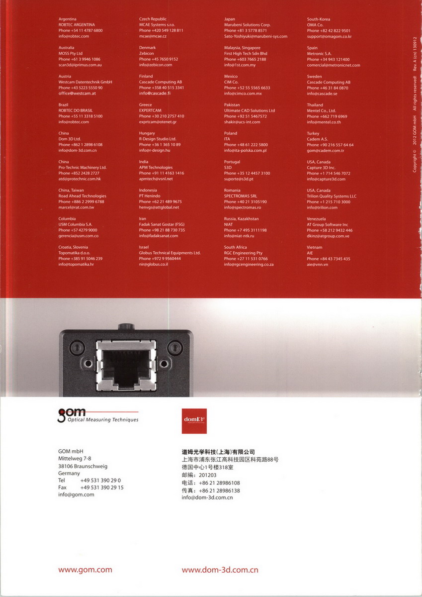 道姆光學(xué)科技(上海)有限公司(DOM 3D LTD)是全球最大的光學(xué)測試技術(shù)企業(yè)- 德國GOM公司在中國的合作伙伴,負責(zé)有關(guān)材料特性測試、動態(tài)變形測試等領(lǐng)域的售前和售后技術(shù)支持和服務(wù);為工業(yè)界和科研教學(xué)領(lǐng)域提供高端的光學(xué)測試設(shè)備,包括三維光學(xué)掃描、三位光學(xué)全場應(yīng)變測試、三位光學(xué)高速應(yīng)變測試、薄板成形網(wǎng)格應(yīng)變測量、三位運動捕捉等;并提供有關(guān)形狀測量和變形測試方面的技術(shù)支持和咨詢及測試服務(wù),旨在為中國客戶提供完整的解決方案;公司總部位于上海,在上海設(shè)有設(shè)備展示廳和測量實驗室,以及零部件倉庫,旨在為中國用戶提供包括優(yōu)質(zhì)、快捷的技術(shù)服務(wù)、培訓(xùn)和項目咨詢及測量服務(wù)。道姆光學(xué)科技(上海)有限公司實力雄厚,重信用、守合同、保證產(chǎn)品質(zhì)量,以多品種經(jīng)營特色和薄利多銷的原則,贏得了廣大客戶的信任。