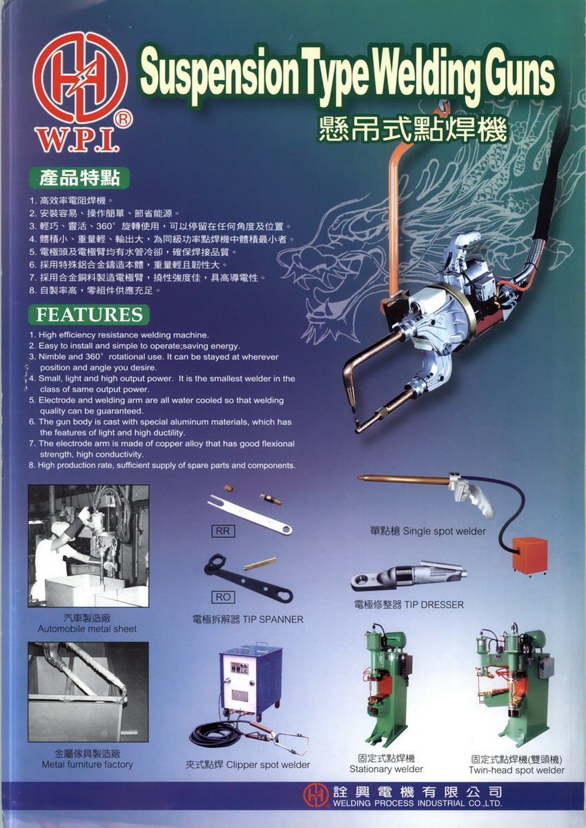 詮興電機(W.P.I.)成立40年,是臺灣唯一專業(yè)于懸吊式點焊機的制造/設計工廠,除專業(yè)于特殊焊機制造,在點焊工程設計及點焊技術研究領域,深受汽車廠的信賴與肯定!詮興槍遍布世界各地,中國大陸,南亞,南非,中東,南美,外銷不斷成長,詮興電機已成為懸吊式點焊機代名詞企業(yè)永續(xù)經(jīng)營!