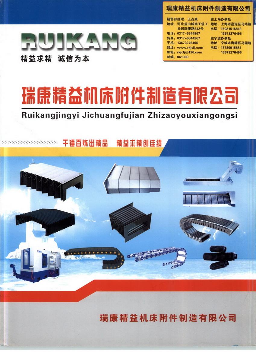 瑞康精益機床附件制造有限公司生產(chǎn)制造各種機床附件產(chǎn)品包括拖鏈、塑料拖鏈、工程塑料拖鏈、鋼制拖鏈、不銹鋼拖鏈、防護罩、風琴罩、卷簾護罩、導軌式防護罩、風琴式防護罩、柔性風琴式防護罩、不銹鋼防護罩、排屑機、冷卻管、墊鐵、金屬軟管、導管護套、工作燈、軟管和接頭等系列產(chǎn)品。我公司十幾年來秉承“信譽至上,用戶”的經(jīng)營宗旨,始終堅持“對用戶服務全方位,讓用戶使用更經(jīng)濟”的服務理念,擁有雄厚的技術力量和齊全的檢測的手段,完整的質保體系,建立了高效的技術保障體系和售后服務網(wǎng)絡,從而保證我們生產(chǎn)銷售的每一件產(chǎn)品在同行業(yè)中具有較高的性能價格比,倍受中外客戶的青睞??茖W的管理,成熟的生產(chǎn)技術,完備的生產(chǎn)工藝,健全的質保體系,保證了公司的產(chǎn)品的高品質和完善的技術跟蹤服。