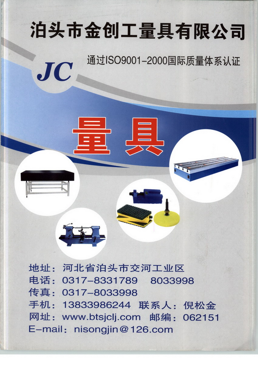 泊頭市金創(chuàng)工量具有限公司位于泊頭市交河開發(fā)區(qū),現(xiàn)有職工500多人,是國內(nèi)從事鑄造、機加工、機床配套的專業(yè)廠家,公司位于河北省泊頭市,京滬鐵路、104國道、106國道、京福高速公路橫穿而過,與我國的兩大直轄市北京、天津近在咫尺。發(fā)達(dá)的鑄造業(yè)為滄州地區(qū)注入了勃勃生機。我公司具有較高的管理水平,技術(shù)力量雄厚,檢測手段完善,設(shè)備精良,制造工藝先進(jìn),產(chǎn)品研制開發(fā)全部采用CAD技術(shù),公司的產(chǎn)品全部按照國家標(biāo)準(zhǔn)加工制造,非標(biāo)產(chǎn)品依照圖紙生產(chǎn)。產(chǎn)品合格率一直在97%以上,2003年上半年以來出廠合格率達(dá)到98.78%。公司的主要產(chǎn)品是斜鐵,機床墊鐵,鑄鐵平臺,機床附件以及其他鑄鐵和花崗石量具產(chǎn)品的設(shè)計、開發(fā)、制造及銷售。公司的產(chǎn)品技術(shù)含量高,符合國家的產(chǎn)業(yè)政策。我公司目前主要的加工設(shè)備有8000mm*4000mm龍門銑床3臺、8000mm*3150mm龍門刨床2臺、6000mm*3150mm龍門刨床2臺、12000mm*3150mm龍門刨床1臺、15000mm*3150mm龍門刨床1臺、4000mm*1500mm龍門刨床1臺、大型搖臂鉆5臺、小型搖臂鉆2臺。