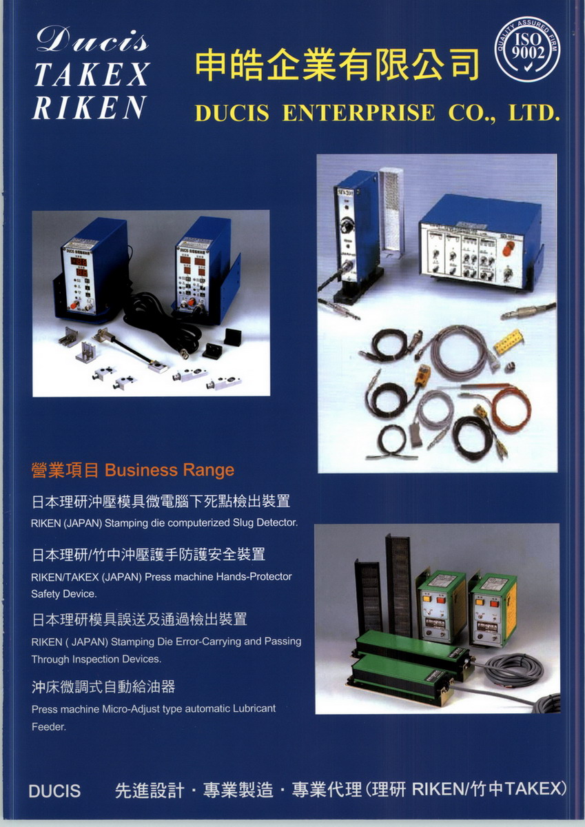 申皓企業(yè)有限公司於民國七十八年成立至今已有二十二年,公司參考先進國家技術(shù),專業(yè)設計、製造生產(chǎn)與銷售沖床周邊自動化系列的機械設備。 主要生產(chǎn)微電腦下死點檢出器、模具誤送及通過檢出裝置、沖床護手防護安全裝置、不銹鋼附自動電磁閥給油桶。更是日本二大光電產(chǎn)品理研、竹中之代理商: 日本理研主要產(chǎn)品:沖床光電護手、荷重監(jiān)視器、誤送檢知、下死點檢知 日本竹中主要產(chǎn)品:沖床光電護手 申皓企業(yè)有限公司之產(chǎn)品行銷於世界各地,以優(yōu)良的品質(zhì)、熱忱、高效、優(yōu)質(zhì)的售後服務 而受到廣大客戶群的技持與愛護,為滿足消費者之需求及方便性,公司於東莞、昆山等地 設立分公司及辦事處,以便及時服務客戶。長久以來,因產(chǎn)品品質(zhì)的不斷改進及定期 為客戶做產(chǎn)品檢修與服務,得到客戶的大力支持與高度信賴,造就申皓在商業(yè)界的良好形 象。與此同時 ,產(chǎn)品的品質(zhì)也贏得了客戶的一致好評。