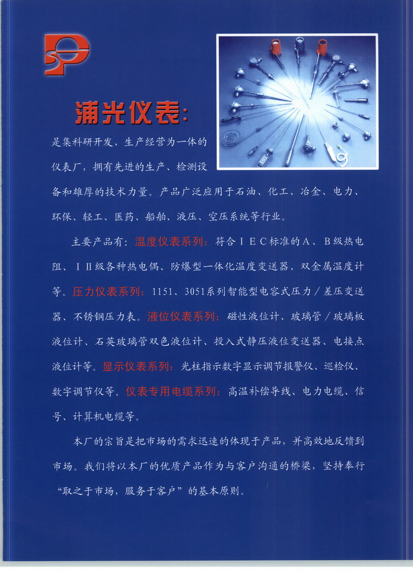 上海浦光儀表廠創(chuàng)建于1993年,是國內較早從事自動化儀表研發(fā)生產的專業(yè)廠家,可為用戶提供系統(tǒng)設計、技術咨詢、工程成套、安裝指導、運行調試、維修服務等一條龍服務。 工廠位于上海市虹口區(qū)梧州路374號,交通便捷。工廠系高新技術企業(yè),技術力量雄厚、生產檢測設備先進,制造工藝精良,已通過ISO9000質量體系認證,使產品質量得到有力保證。產品廠泛應用于航天、軍工、電力、化工、石化、環(huán)保、市政、建筑、冶金、制藥、食品、水處理等行業(yè)。工廠也成為中石化、中石油定點企業(yè),同時也是全國化工企業(yè)推薦的合格儀器儀表供應方。 本廠研制、開發(fā)、生產的產品涉及六大系列、400多個品種。溫度儀表系列:符合IEC標準的A、B級熱電阻、Ⅰ、Ⅱ級各種熱電偶、防爆型一體化智能溫度變送器等;壓力、差壓儀表系列:普通壓力/差壓變送器、智能型電容式壓力/差壓變送器等;液位儀表系列:玻璃管/玻璃板液位計、磁性液位計、石英玻璃管雙色液位計、電接點液位計、投入式靜壓液位變送器、電浮筒液位變送器等:流量儀表系列 :全中文智能渦街流量計、全中文智能渦輪流量計、流量積算儀等;顯示儀表系列:光柱指示數字顯示調節(jié)報警儀、智能型數字調節(jié)儀表等;儀表專用電纜系列:高溫補償導線、RV、BV系列聚氯乙烯屏蔽電纜、KV系列交聯(lián)阻燃、電力電纜,信號、計算機電纜等。 工廠自成立以來一直秉承“誠實守信、精益求精、服務第一、客戶至上”,的理念,堅持“以人為本、以品牌為目標、以市場為導向,以服務為生命,以品牌為目標,以管理為保證”的經營哲學,竭誠為客戶提供一流的產品和一流的服務。浦光愿作您永遠的朋友,與您攜手共享成功!