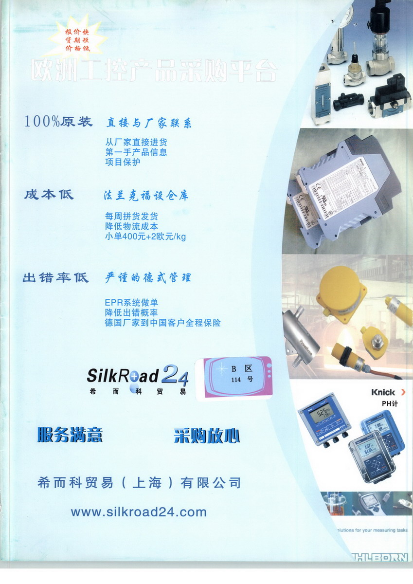 Silkroad24于1999年在德國Braunschweig市成立。成立之初,德國Silkroad24 即“絲綢之路全天候”作為歐洲德語區(qū)(德國,奧地利,瑞士等)多家著名自動化中小企業(yè)的中國總代理,主要負(fù)責(zé)其中國市場的開發(fā)以及銷售管理。2006年Silkroad24希而科貿(mào)易(上海)有限公司在上海張江高新科技園成立,其發(fā)展目標(biāo)是成為國內(nèi)領(lǐng)先的歐洲自動化儀器儀表,備品備件供應(yīng)商。時至今日,在張江高新科技園區(qū)擁有辦公面積800多平米,僅德國供應(yīng)商就達(dá)400多家,應(yīng)用領(lǐng)域包括鋼廠、電廠、化工、汽車、機械、流體、自動控制等行業(yè)。公司實行嚴(yán)格的德式管理,內(nèi)部分為業(yè)務(wù)部,后勤部,技術(shù)部,組織結(jié)構(gòu)清晰,分工明確,公司工程師都是本科及本科以上學(xué)歷,提供選型,商務(wù)加售后服務(wù),并指導(dǎo)安裝調(diào)試。ERP系統(tǒng)做單,可以提供訂單全程查詢。德國法蘭克福倉庫拼貨,為客戶節(jié)約了成本,提高了采購效率。我們直接與歐洲廠家聯(lián)系,快捷,有效的溝通,提供100%原裝正品,真正做到了讓客戶服務(wù)滿意,采購放心。
