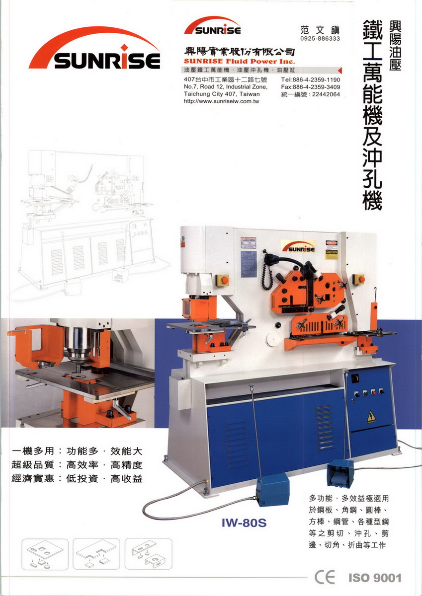With a highly dedicated team, Sunrise Fluid Power Inc. has been specializing in the manufacturing of hydraulic ironworkers, punching machines, bending machines, and other hydraulic machinery and equipment for over 25 years. Total customer satisfaction is our number one goal. We are passionate about providing engineering excellence in everything we do, and we are dedicated to manufacturing world-class, high-value products for our global customers.Sunrise is ISO-9001 certified by BVQI, and our products meet the CE safety requirements and regulations. We relentlessly seek continuous improvement and product development. Currently Sunrise has the broadest range of ironworker and punching machine models compared to any other manufacturer. Sunrise product advantages: Durability, Accuracy, and Versatility. Besides our very popular single and dual operator models, we have introduced the K-series, a new line of ironworker with vertical movement at all stations. The center beam in the entire range of K-series moves in straight up and down motion to provide less deformation, better results and longer tooling lifeQuality of the highest standard is the key factor in success. All key components of our ironworkers, punching machines, etc. are made in-house at our modern plant and automated production lines. We use the latest control system to ensure highly efficient production, and the quality assurance team measures and tests each component to ensure precision standards of machined parts are met or surpassed. Finally, before shipping, each complete machine goes through intensive quality and performance tests to make absolute sure it meets our strict company quality standards before it arrives at the customer’s operation.Our global sales network covers almost 50 countries in Europe, Australia, North America, Southeast Asia, the Middle East and more. This coverage, combined with the quality of our machines, makes Sunrise one of the best choices when it comes to metal forming. In this highly competitive international market, Sunrise's market share continues to grow. Thank you to our many and growing list of satisfied customers for your continued support. Sunrise is now one of the leading brands in the fabricating industry. We look forward to your continued support and comments -- together we will push quality at Sunrise ever higher.