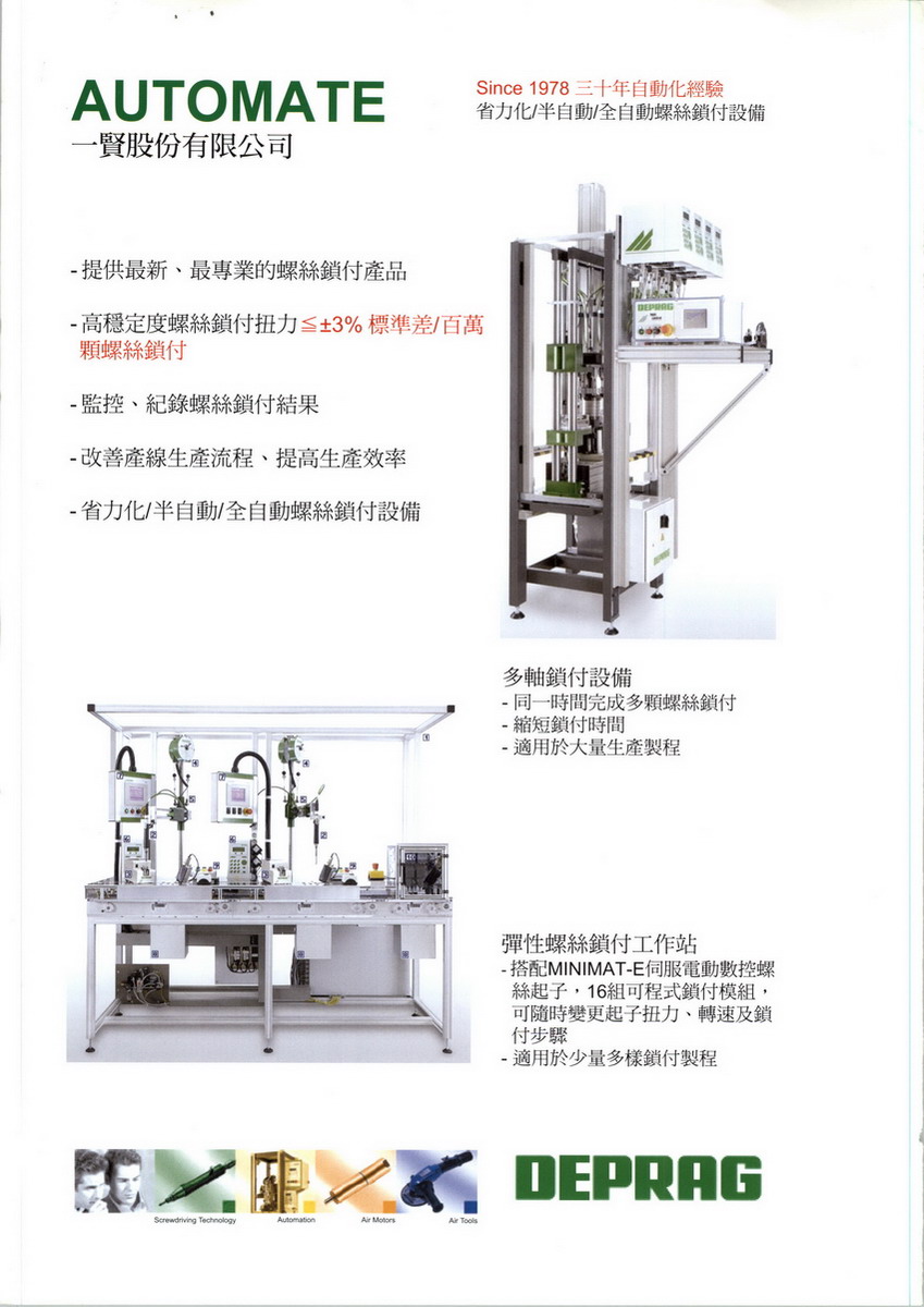 一賢股份有限公司成立於1978年,主要產(chǎn)品為:德國(guó)BOSCH REXROTH HAFNER氣壓配件、德國(guó)DEPRAG自動(dòng)鎖螺絲機(jī)及氣動(dòng)工具、德國(guó)SCHMIDT精密系列沖床、日本JANOME桌上型及水平關(guān)節(jié)機(jī)械手臂、美國(guó)Compact Air氣缸、一賢氣密機(jī)及鋁擠型。 成立之初,國(guó)內(nèi)產(chǎn)業(yè)自動(dòng)化正值起步,業(yè)界對(duì)自動(dòng)化需求日益增漲,在褚子喦 總經(jīng)理的帶領(lǐng)下,一賢本著提供"高品質(zhì)產(chǎn)品、一流專業(yè)知識(shí)及技術(shù)",自工業(yè)技術(shù)領(lǐng)導(dǎo)世界的工業(yè)大國(guó)德、美引進(jìn)空壓元件以服務(wù)廣大市場(chǎng)所需。在歷經(jīng)20年的努力及改進(jìn),其技術(shù)及產(chǎn)品品質(zhì)已深獲業(yè)界的肯定及支持,十年前,一賢公司憑藉著對(duì)自動(dòng)化的專業(yè)知識(shí)及對(duì)市場(chǎng)需求的高敏感度,在臺(tái)灣產(chǎn)業(yè)趨向逐日走向高精度、高品質(zhì)的同時(shí),積極與國(guó)外知名大廠接洽,取得精度倍受肯定及各國(guó)大廠指定使用的德國(guó)SCHMIDT精密系列沖床,及享有近百年氣動(dòng)自動(dòng)設(shè)備經(jīng)驗(yàn),在自螺絲鎖付獨(dú)具特色的德國(guó)DEPRAG自動(dòng)鎖螺絲機(jī),及在機(jī)械手臂製造享有盛名之日本JANOME桌上型,關(guān)節(jié)型機(jī)械手臂的代理權(quán),盼為"精密臺(tái)灣,品質(zhì)臺(tái)灣"的未來(lái),盡一己之力。