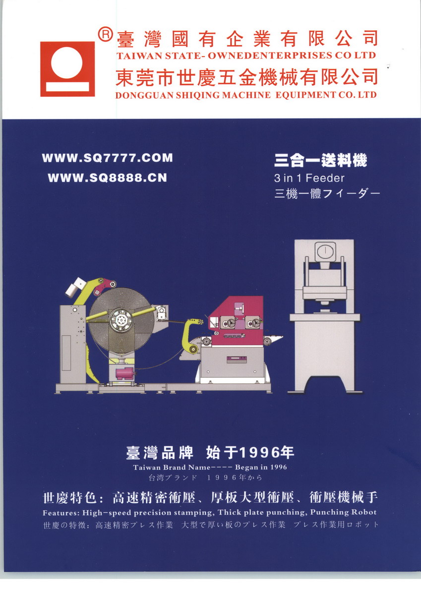 東莞市世慶五金機(jī)械有限公司總公司位于世界制作之都東莞,是臺灣老牌沖壓周邊廠家,全球知名品牌之一,也是全球產(chǎn)品種類最齊全的生產(chǎn)廠家之一。于1996年在東莞設(shè)立的大陸地區(qū)總部,參考先進(jìn)國家技術(shù),專業(yè)生產(chǎn)與銷售沖床周邊自動(dòng)化系列的機(jī)械設(shè)備以及整廠設(shè)備。本公司具有精良的技術(shù)和多年的經(jīng)驗(yàn),滿足客戶的生產(chǎn)需求,以優(yōu)良的品質(zhì)及熱忱高效、優(yōu)質(zhì)的售后服務(wù)作為精神和基本政策。長久以來,因產(chǎn)品品質(zhì)的不斷改進(jìn)及定期為客戶做產(chǎn)品檢修與服務(wù)。得到廣大客戶的大力支持與高度信賴,造就世慶公司在商業(yè)界的良好形象,與此同時(shí),產(chǎn)品的品質(zhì)也贏得了客戶的一致好評。 隨著市場占有率的提高,產(chǎn)品不僅銷售中國大陸各地、還遠(yuǎn)銷世界很多國家,并成功登陸日本市場。世慶的銷售網(wǎng)路遍及中國大、中、小城市,并在上海、寧波、福州、廈門、中山等城市設(shè)有分公司和辦事處。世慶五金沖床周邊設(shè)備為眾多電腦、電子、手機(jī)、五金等與之相關(guān)的企業(yè)提供了理想的設(shè)備。公司的售后服務(wù)機(jī)制完善,服務(wù)快捷,24小時(shí)專業(yè)維護(hù),及時(shí)解決客戶的疑難問題,展望未來,公司將秉持"誠實(shí)守信、品質(zhì)'專業(yè)、服務(wù)"為我們服務(wù)大眾的宗旨,"品質(zhì)第一,用戶至上、互利互榮"更是公司全體同仁共同遵循的經(jīng)營理念.這個(gè)理念將激勵(lì)我們努力不懈,為廣大客戶提供更高層的服務(wù)。